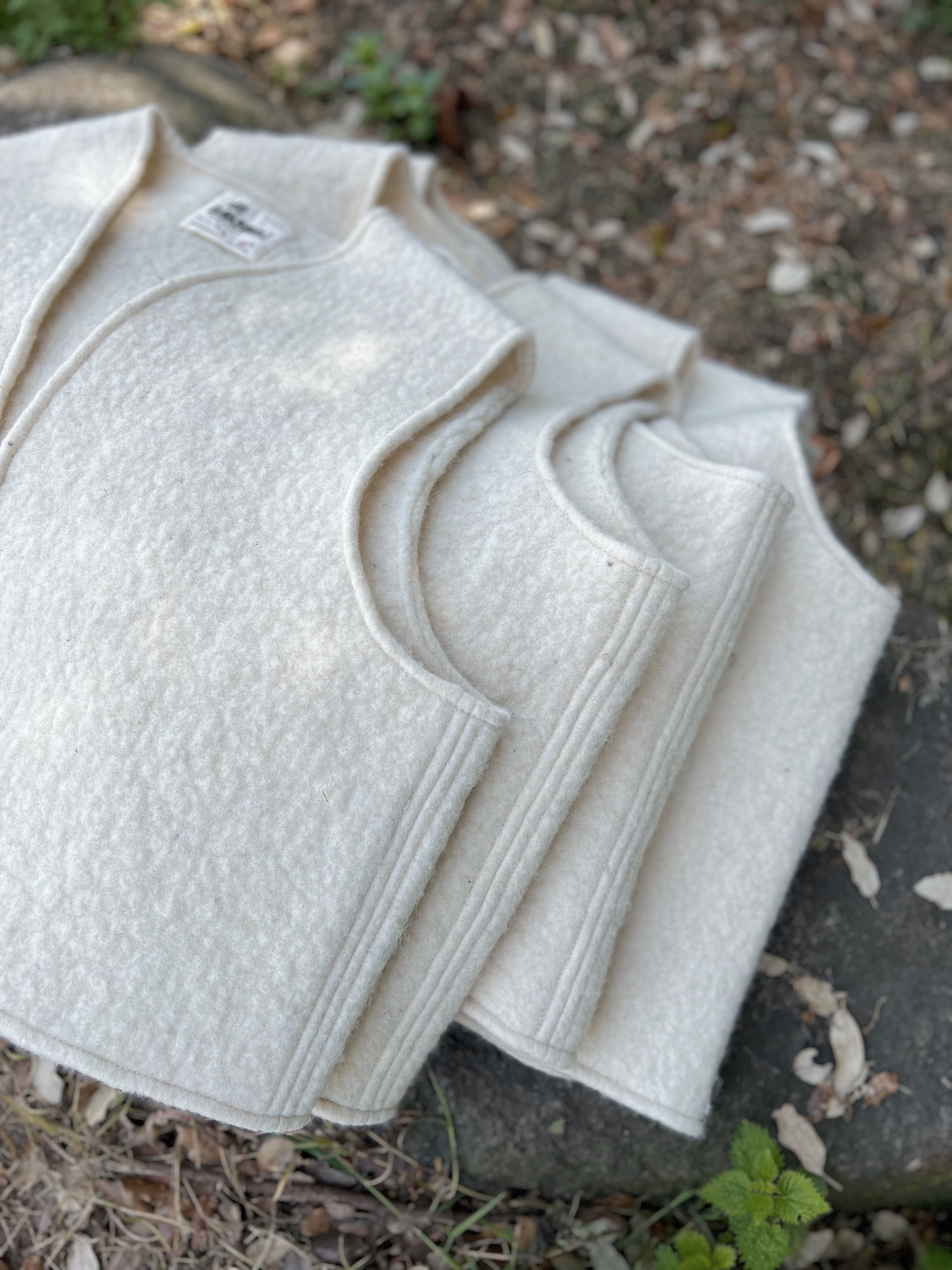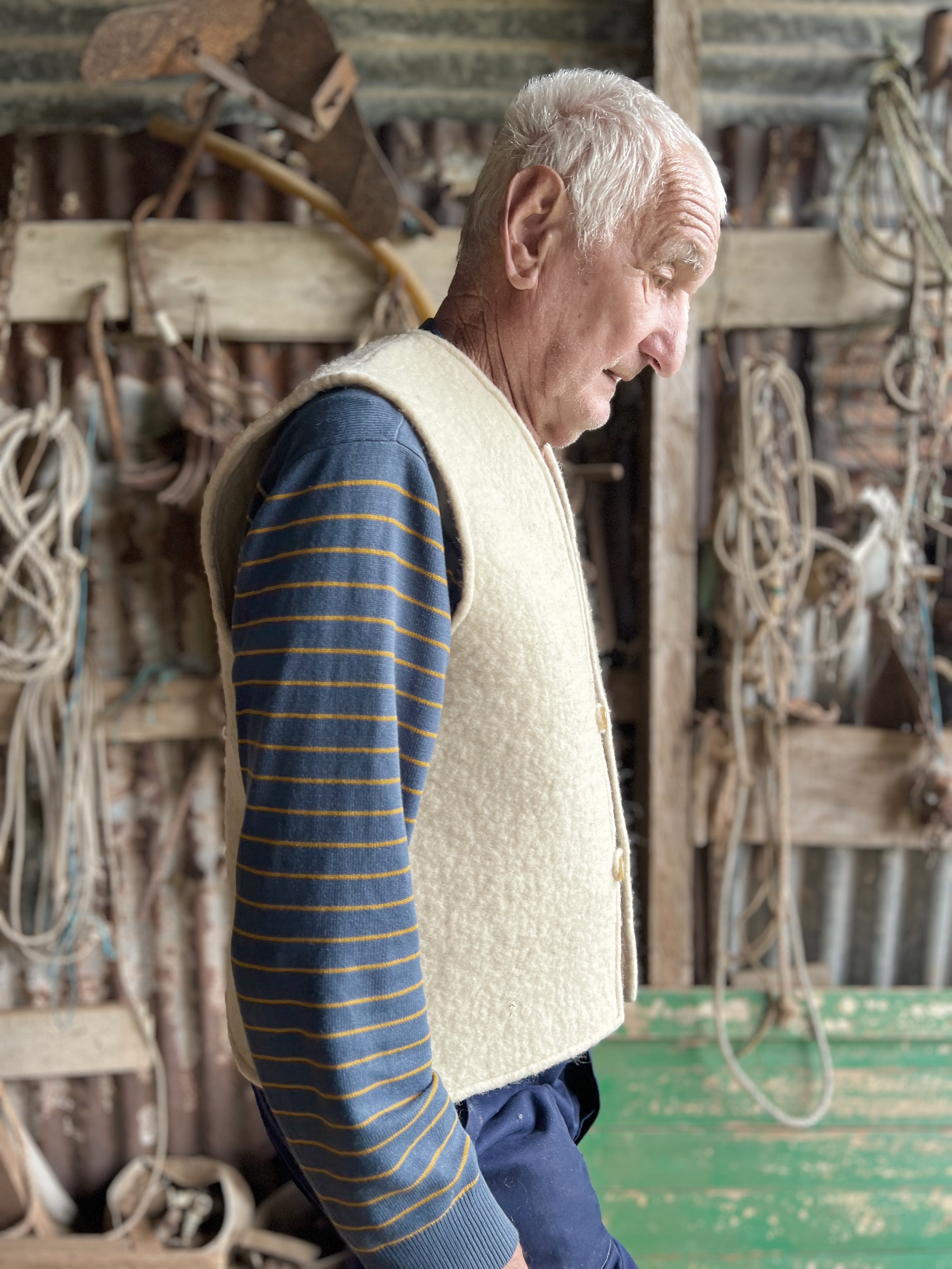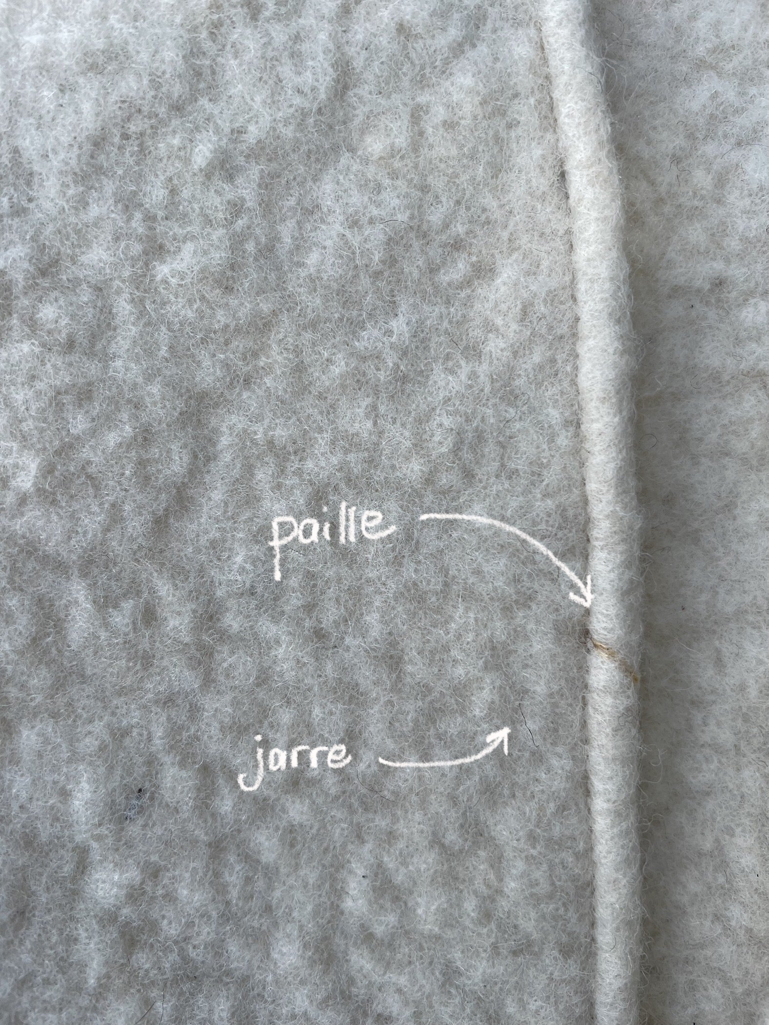 Vous observerez probablement une petite odeur naturelle dans la laine — gage de qualité chez les irlandais et leurs pulls ! — qui n’est autre que celle de nos moutons, et qui partira rapidement, au fur et à mesure. Quelques brins de paille et restants de couleurs* peuvent aussi être présents. Ces derniers illustrent la vie au grand air des animaux et le marquage de distinction par le berger sur son troupeau. Quant au jarre, ce petit poil noir relativement visible, n’est rien que l’autre composant naturel des toisons de moutons. Son rôle est de protéger l’animal en cas d’intempéries. Il tombera avec le temps, autrement vous pouvez l’enlever à la main ou à l’aide d’une pince à épiler. Concernant la couleur de la laine, naturellement écrue et non teinte, celle-ci peut comporter une légère variation de ton, d’une veste à l’autre. Pour cause, chaque mouton possède son propre pelage. Par ailleurs, en raison de la nature vivante de la laine ainsi que de la façon artisanale de fabriquer notre feutre et notre Veste Berger, il se peut qu’il y ait une mince différence, de quelques dizaines de g/m², dans l’épaisseur du feutre de nos vestes; de même que +/- 1cm d’écart, sur nos pièces d’une même taille.