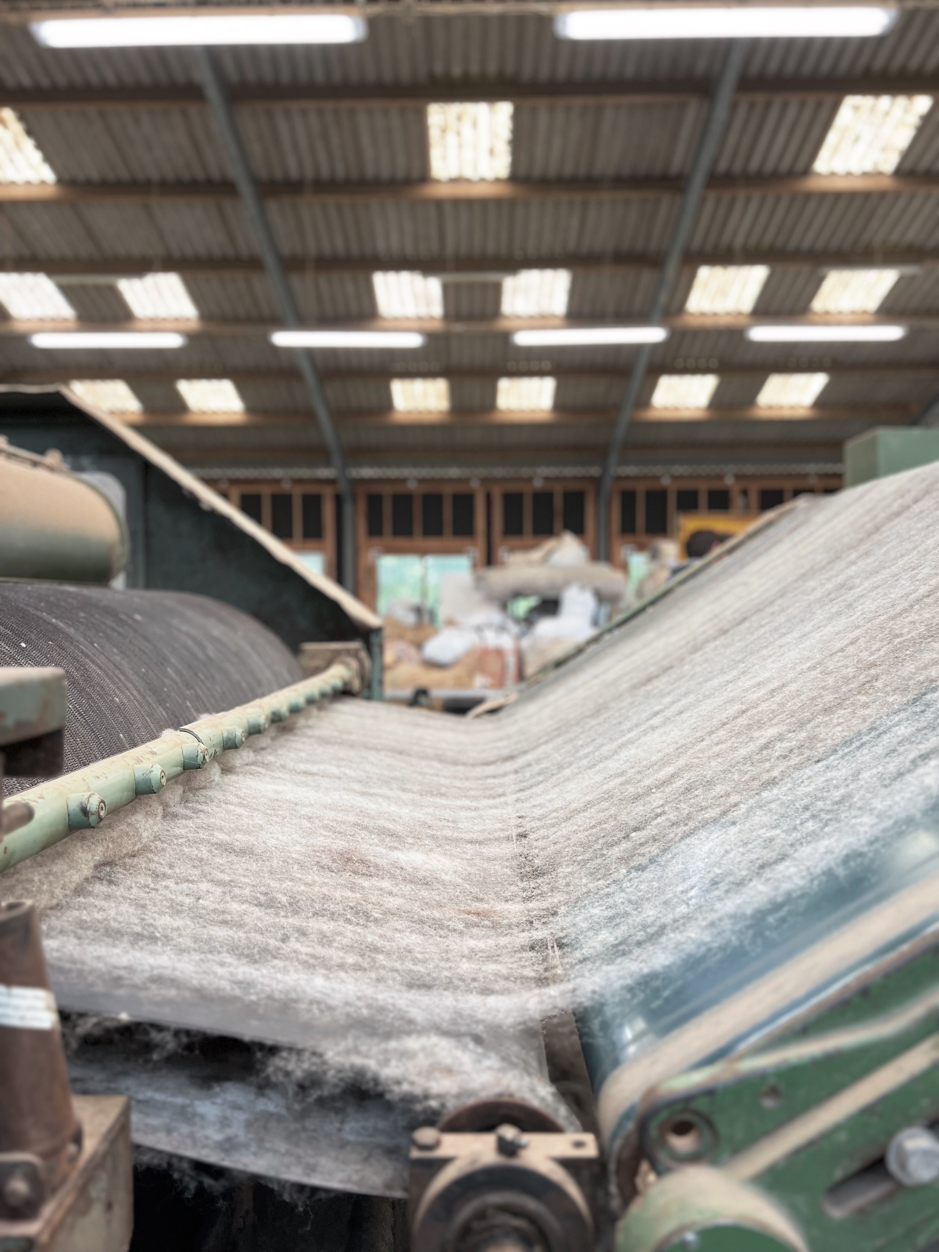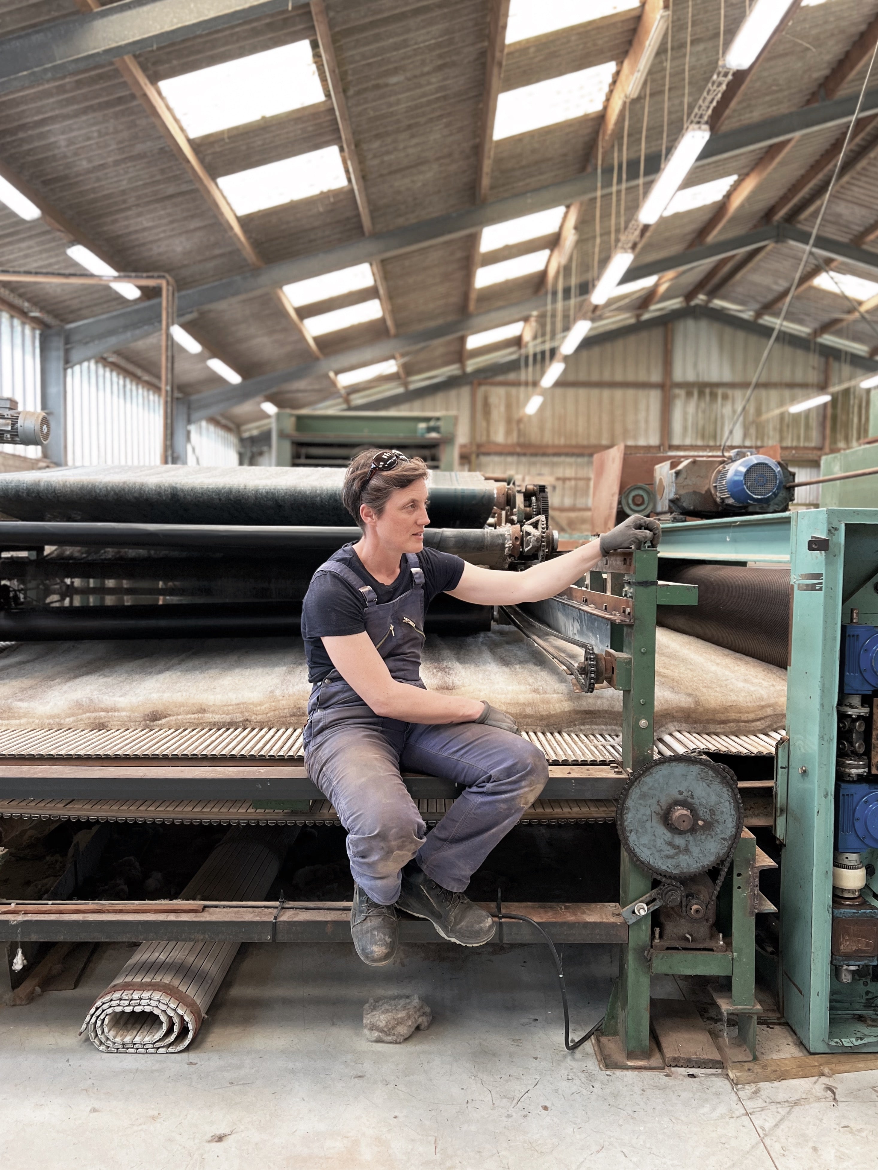 Premièrement, le feutre qui compose les empiècements de notre Veste Berger est confectionné en Bretagne, par Énora, avec l’aide d’anciennes machines remises en état par ses soins et sauvées d’une manufacture française dorénavant close. Avant de feutrer la laine de Benjamin, notre éleveur, Énora doit en premier lieu la laver, à l’eau de cendre et au savon, afin d’en enlever le « suint », c’est-à-dire la matière grasse produite par l’animal et présente dans la laine, ainsi que les restants de végétaux et autres déchets naturels. Ensuite, la laine passe à l’étape du cardage et ressort sous forme de nappe cardée, autrement dit, les fibres sont peignées et alignées pour former une nappe voluptueuse et aérée. Une fois sortis de la carde, les voiles de laine sont superposés avant de passer dans une aiguilleteuse, qui, pour sa part, grâce à ses centaines d’aiguilles, permet d’entremêler les fibres afin de densifier ce matelas de laine, et de le rendre moins épais. Puis, enfin, vient l’étape du feutrage. Grâce à la combinaison de l’eau chaude savonneuse et du battement mécanique de la laine, ses fibres vont, petit à petit, se lier pour former ce textile intissé, appelé « feutre ».