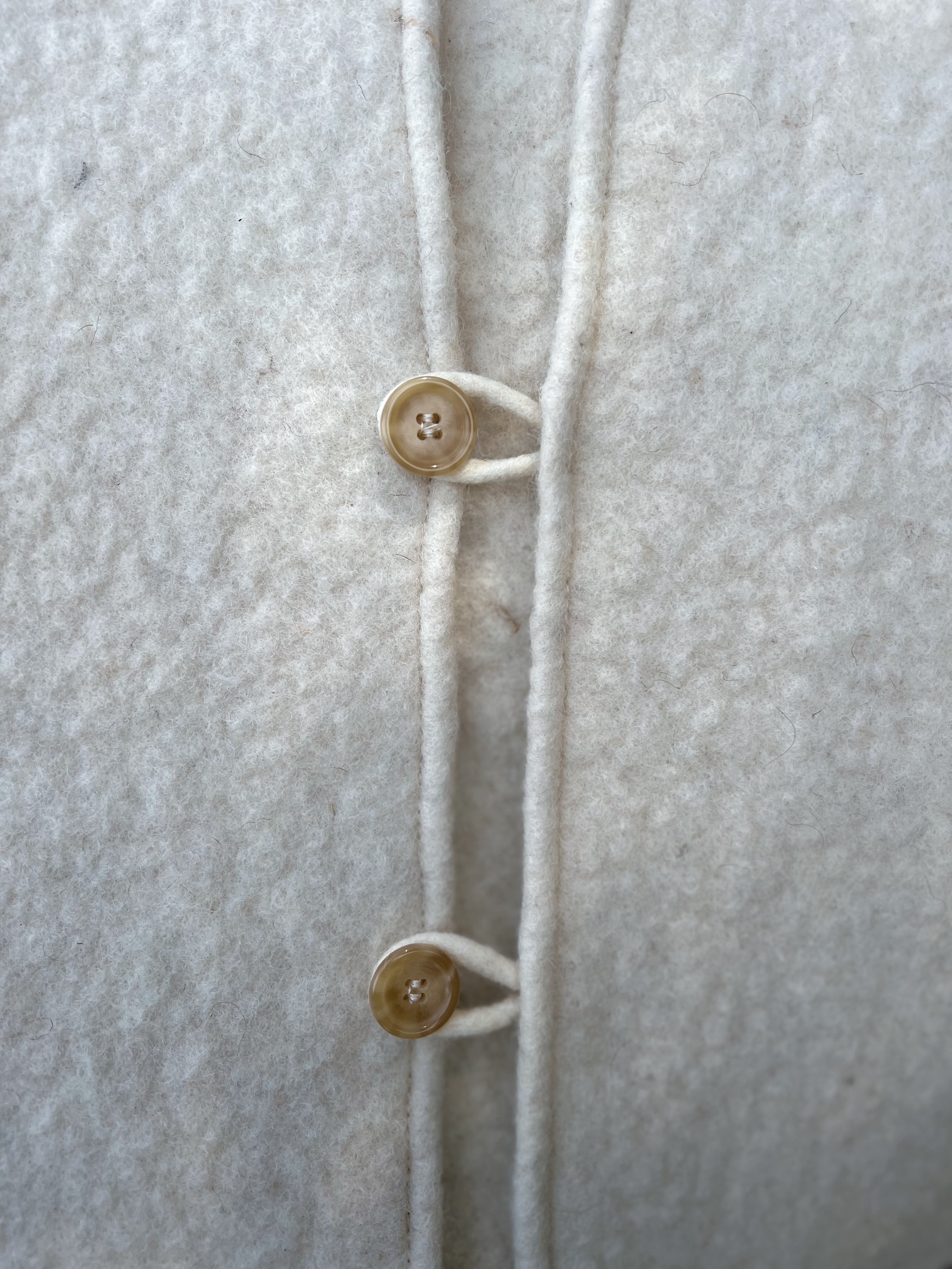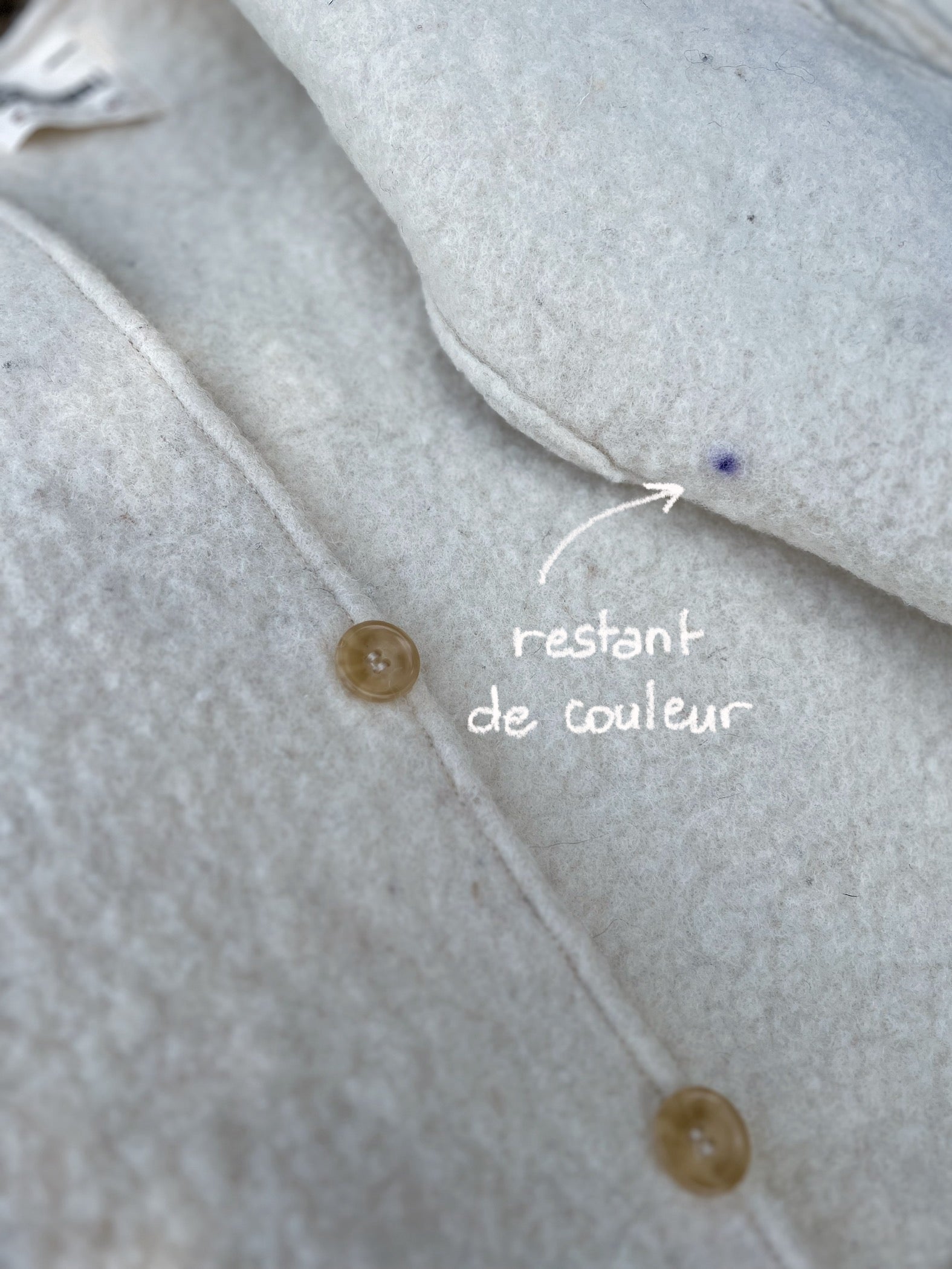 Notre laine est issue de moutons élevés en bio et en plein air, en Normandie, par Benjamin et sa femme Audrey. Chaque année, au printemps, à lieu la tonte, durant laquelle le tondeur professionnel se charge de délester les bêtes de leur toison. Une fois collectées, ces dernières sont triées, par l’éleveur lui-même, à la main. La laine est ensuite confiée à Énora, en Bretagne, pour être lavée à l’eau de cendre et au savon doux, avant d’être feutrée, à l’aide d’anciennes machines remises en état, après avoir été sauvées d’une vieille manufacture française ayant fermé ses portes. Nos boucles sont, quant à elles, feutrées une par une, manuellement, par Stéphanie et son équipe, en Auvergne-Rhône-Alpes, dans un atelier accueillant des personnes éloignées de l’emploi, dont l’objectif est de leur permettre une insertion sociale. Nos boutons répondent à la norme Oeko-Tex® et sont fabriqués dans les Hauts-de-France par une « Entreprise du Patrimoine Vivant » datant du XIXème siècle. Et enfin, la pièce est découpée et cousue dans les Pays de la Loire, dans un atelier où se trouvent des couturières fabuleuses, qui travaillent au service des plus grandes maisons de luxe françaises.