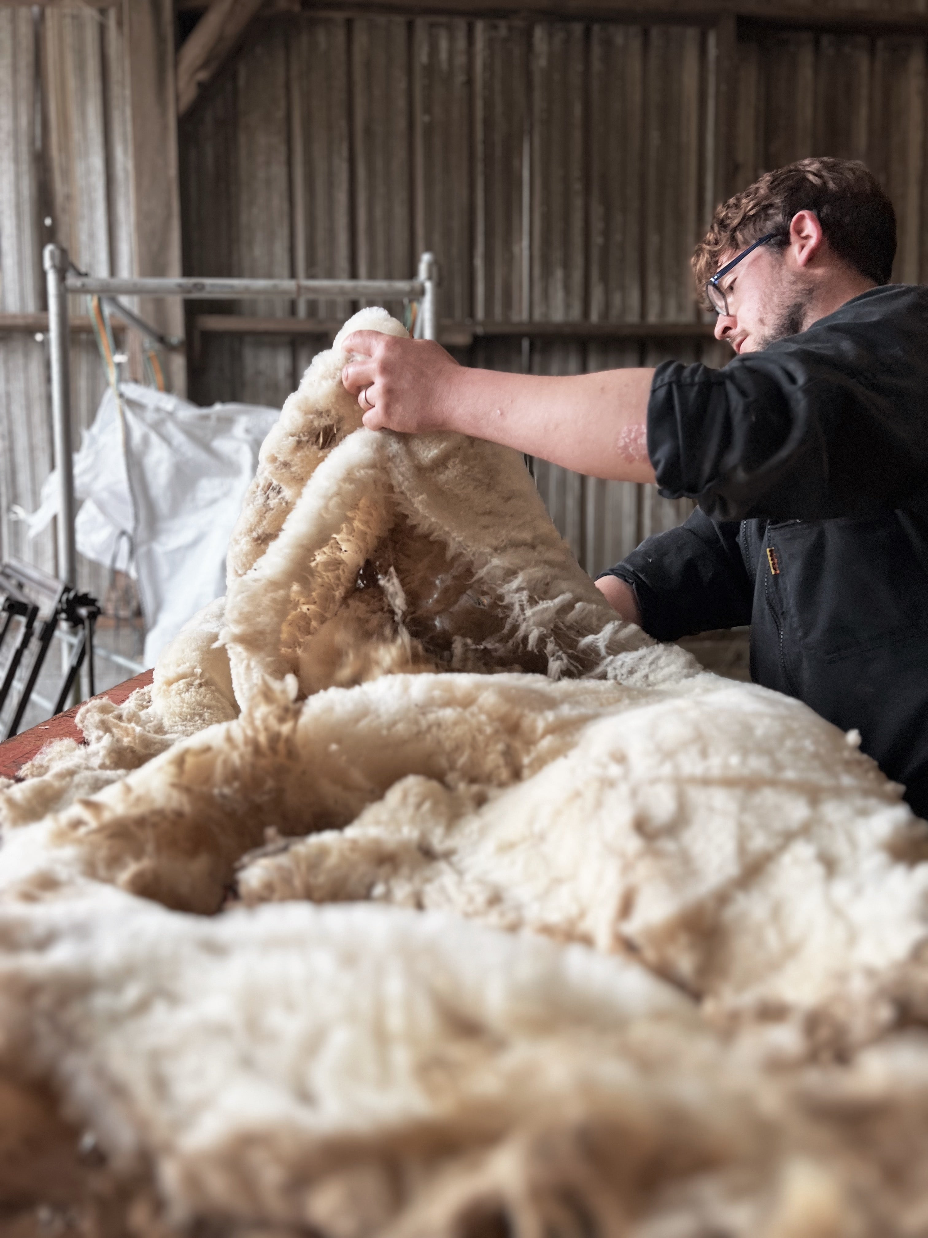 Porter de la laine française, c’est faire le choix d’une matière noble, tout en prenant part à une économie plus vertueuse. Puisque chaque éleveur de moutons se doit de tondre ses animaux 1 à 2 fois par an — pour des raisons d’hygiène et de bien-être de l’animal —, c’est aussi leur permettre d’obtenir un petit complément de revenu, tout en « bouclant la boucle » de leur circuit de production, comme le dit si bien Benjamin, notre éleveur normand, à qui nous achetons la laine. Chez lui, les moutons passent le plus clair de leur temps à l’extérieur — sauf en cas de mise-bas — et sont nourris exclusivement aux céréales bio de leurs propres cultures et à l’herbe. Leurs terres sont ainsi naturellement entretenues, ce qui favorise le maintien et l’équilibre naturel des sols, tandis que les animaux, eux, ne font que respecter leur nature herbivore. Ces derniers sont tondus 1 fois par an, au printemps, avec l’aide d’un professionnel de la tonte, — que l’on appelle tout simplement « tondeur » — avant que ce ne soit Benjamin lui-même, qui se charge de trier, à la main, les toisons récoltées, afin d’en enlever le maximum de végétaux et autres mauvaises parties. La laine nous est ensuite livrée par transport routier et une seconde vie peut enfin commencer pour elle. Ce qu’était alors, depuis l’effet de globalisation, considéré comme un déchet en France, retrouve enfin ses lettres de noblesse.